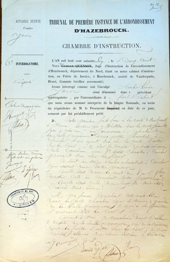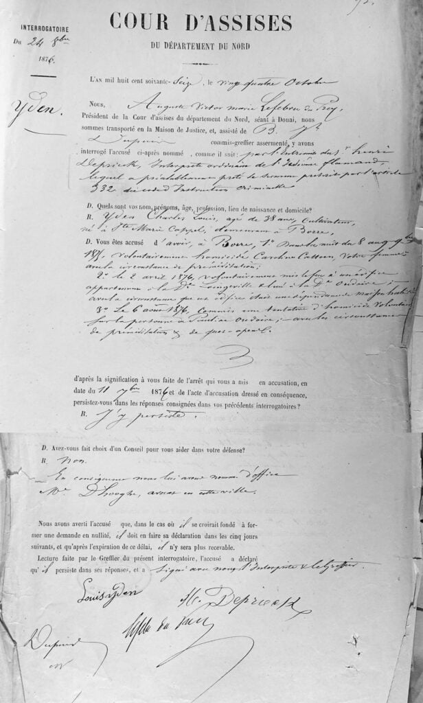 Voilà dix jours qu’avait débuté l’instruction menée par le juge Demazière suite à la tentative d’assassinat perpétrée par Louis Yden contre Pauline Oudoire. L’inculpé avait avoué deux autres crimes. D’abord l’incendie de la ferme Oudoire dans la nuit du 2 au 3 avril dernier. Puis le meurtre de sa femme Caroline Catoen dans la nuit du 8 au 9 novembre 1875.