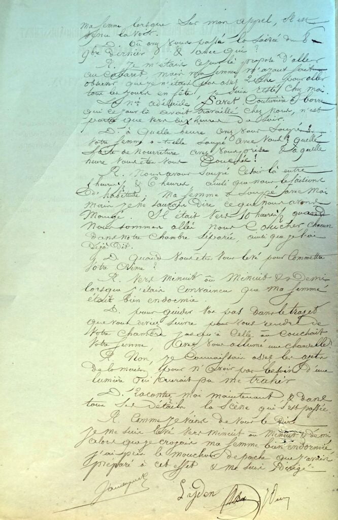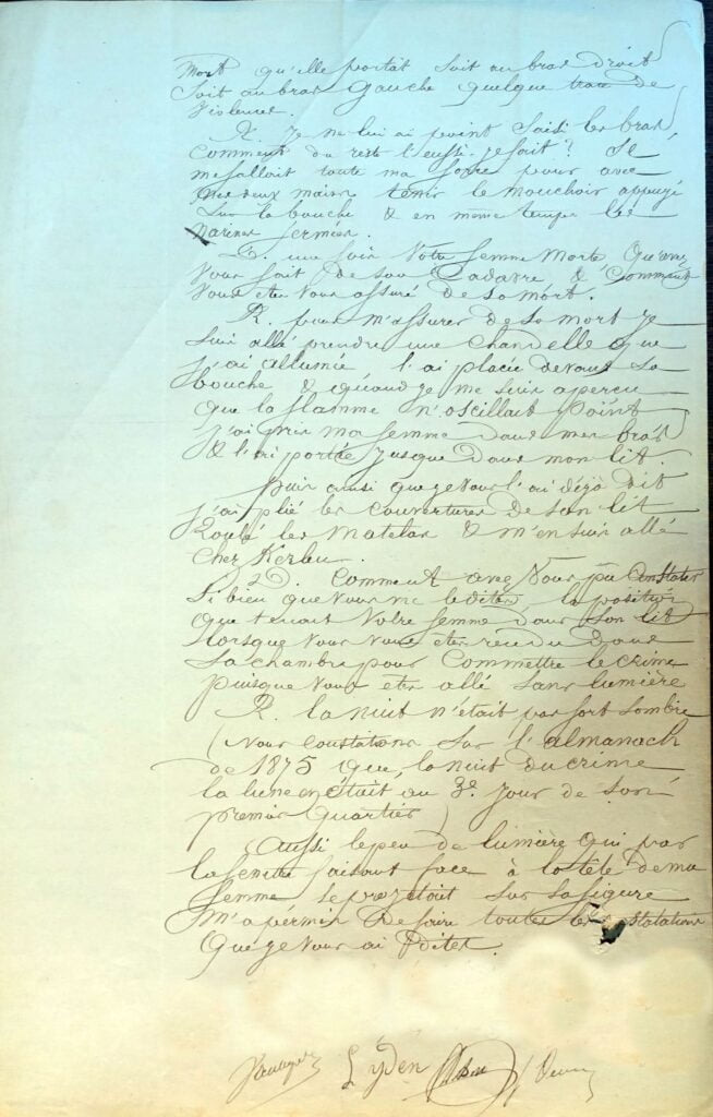 A diverses reprise il avait fait des expériences sur lui-même. Il avait pris un mouchoir qu’il avait plié en quatre et se l’était appliqué sur la bouche d’une main, en serrant ses narines de l’autre. Il avait constaté que l’air n’était pas suffisamment intercepté de cette façon et il avait mouillé son mouchoir en plaçant dans le milieu une feuille de papier. Cette fois le succès lui parut certain ; aussi déjà 15 jours avant le 9 novembre, il avait voulu consommer son crime. Pendant la nuit, alors qu’il se trouvait couché avec sa femme, il l’engagea à étendre ses mains sous la couverture pour pouvoir plus facilement l’asphyxier avec le mouchoir qu’il avait placé sous son oreiller ; mais elle le désarma en lui demandant sous forme de plaisanterie s’il voulait l’étouffer. Il remit à un autre jour l’exécution de son œuvre criminelle.