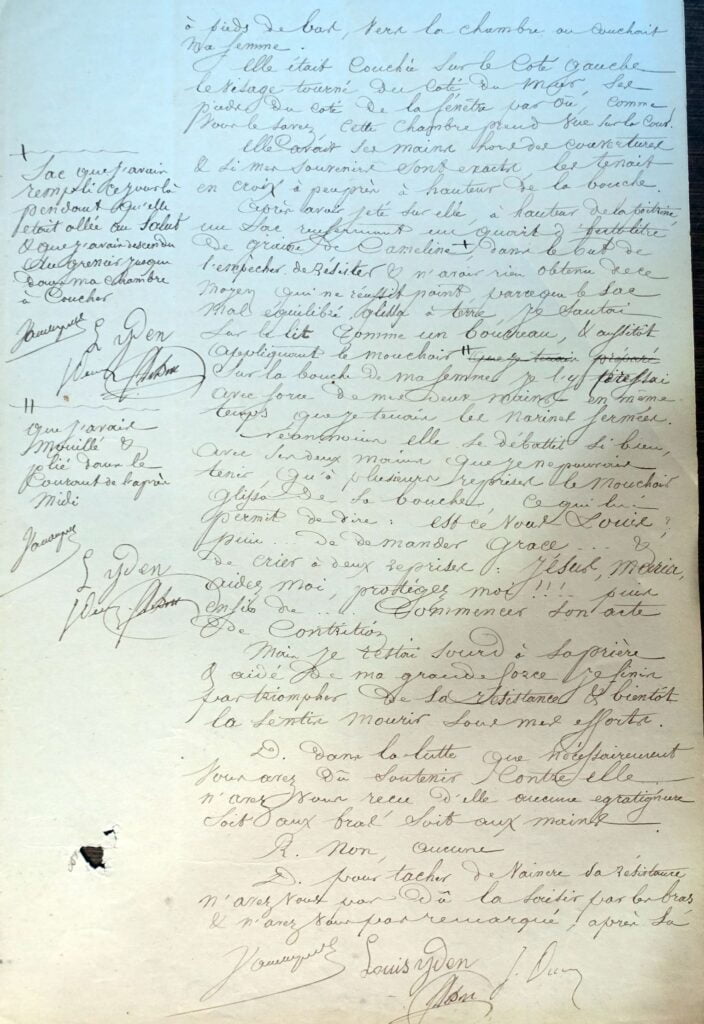 – S’agissant de Caroline Catoen : « les résultats révélés par l’autopsie de la femme Yden, Justine, Caroline, Amélie, née Catoen, sont en parfait accord avec les aveux de l’inculpé Yden Louis »