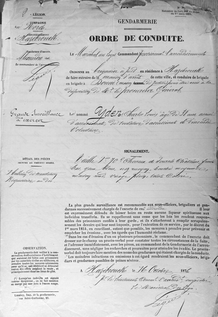 Le 5 août, la veille du crime, il était allé à Dunkerque pour acheter un pistolet. N’ayant pas trouvé un armurier, il s’était rendu à Lille où il n’avait pu réussir davantage dans ses démarches. Il s’était alors rappelé qu’un de ses voisins avait un fusil à deux coups. Le lendemain matin 6, il s’était rendu vers 7 heures chez le Sr Beun et lui avait emprunté son arme sous prétexte de tuer un lièvre qui causait du dommage à ses récoltes. Rentré chez lui, Yden avait chargé le fusil avec du gros plomb, puis il avait rédigé une note concernant certaines dispositions, faisant suite à une lettre écrite deux jours auparavant, dans laquelle il expliquait longuement les motifs qui le décidaient à tuer la fille Oudoire et à se suicider ensuite.